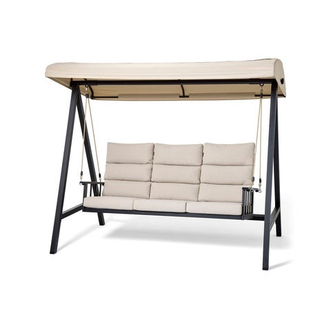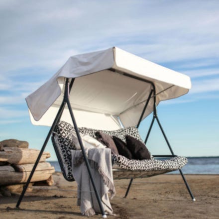 Kaunis pihakeinu trendikkäällä pehmusteella! Kotimainen puutarhakeinu on kestävää tekoa. Metallikeinun hinta sisältää pehmusteet ja katoksen.