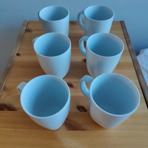 Osa on ollut enemmän käytössä arjessa, kun taas osa on melkein käyttämättömiä (käytetty ehkä 3 kertaa isommissa juhlissa). Joissakin tarrat ovat irronneet pesukoneessa, mutta muuten kaikki ovat toai hyvässä kunnossa, ja posliini on ehjää.