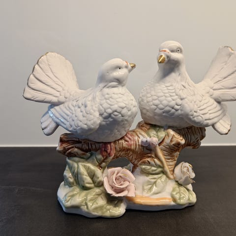 Koristeellinen posliinimaljakko, jossa on kaksi lintua ja kukkakoristeita. Maljakko on väriltään vaaleanpunainen ja valkoinen, ja siinä on kultaisia yksityiskohtia.Tämä maljakko edustaa klassista koristeellista tyyliä, joka on suosittu posliiniesineissä.