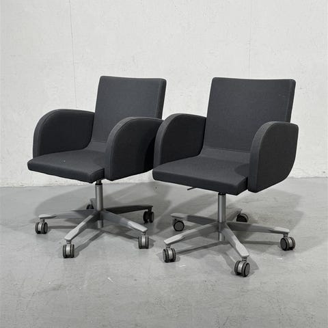 Kaksi Kinnarps Koy malliston mukavaa neuvottelu tai toimistotuolia, joissa on pyörät ja säädettävä korkeus pumpulla. Tuolit ovat tummanharmaat ja niissä on pehmustetut käsinojat.