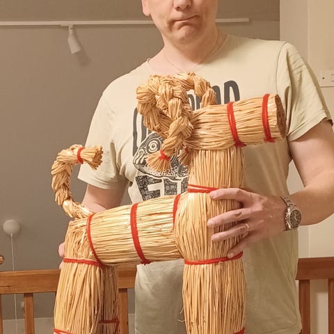 Olkipukki, joka on koristeltu punaisilla nauhoilla. Pukin korkeus on noin 120 cm ja pituus noin 100 cm. Olkipukki on perinteinen koriste-esine.Tämä tuote sijaitsee Tavara Rahaksi myymälässä.