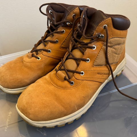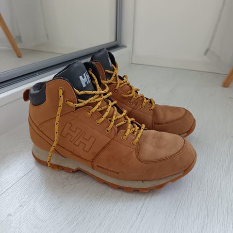 Helly Hansen talvikengät, koko 46. Varren pituus nilkkamittainen. Väri ruskea/kamelinruskea, keltaiset nauhat ja kumipohja. Päällinen näyttää olevan mokkanahkaa tai mokkapintainen materiaali, sisäosa pehmustettu. Pohjassa karkea kuviointi, joka on suunniteltu antamaan pitoa talviolosuhteissa. Sopivat arkikäyttöön ja ulkoiluun viileällä säällä.