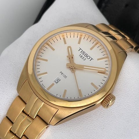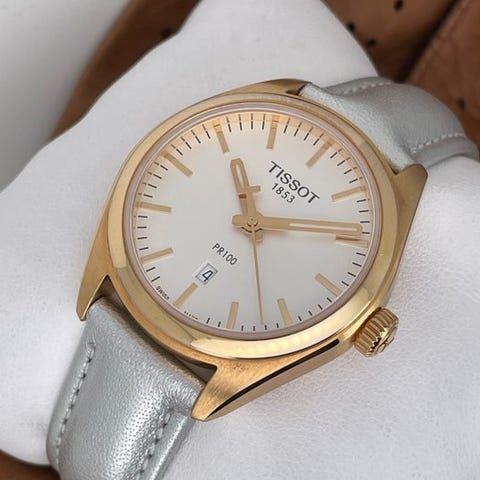 Tissot - T101.210.33.031.01Kotelo: ruostumaton teräs roosa kultauksellaKellomekanismi: Swiss made quartzKellotaulu: hopeinenLeveys: 33 mm (kroonin pois lukien)Lasi: safiirilasiRanneke: alkuperäinen kultauksin varustettu teräsrannekeRanteen ympäry: n. 18 cmKunto: Uudenveroisessa kunnossa!Takuu: 1 vuosi "de Horlogemeesters"Toimitus: alkuperäisessä laatikossa + aitoussertifikaatti "de Horlogemeesters"Akickiretut ja vakuutettu toimitus (DHL-express).