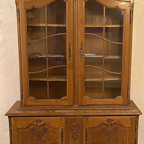 Vitriinikaappi, jossa on koristeelliset kaiverrukset ja lasiovet. Kaapissa on sisällä useita hyllyjä, alla vetolaatikot ja alakaapit tarjoavat lisäsäilytystilaa. Kaksiosainen ja raskas.