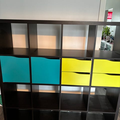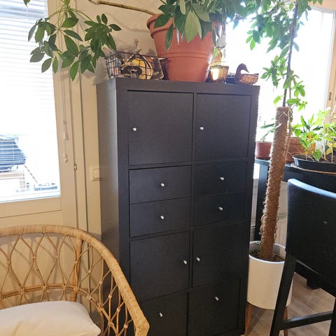 3x4 lokeroa, musta ja taakse laitettu musta levy. Toiminut kassatiskinä. Kahdessa lokerossa vetolaatikko-osat, eli yhteensä 4 kiskoilla toimivaa vetolaatikkoa.