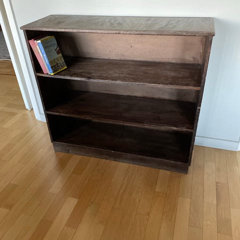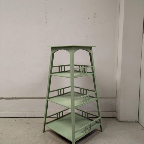 Sympaattinen vanha puinen hyllykkö myytävänä. Pinta aikanaan maalattu. Maalissa ajan tuomaa jälkeä paikka paikoin. Ei hajuja. Hyllyt korkeussäädettävät. Rakenne tukeva.