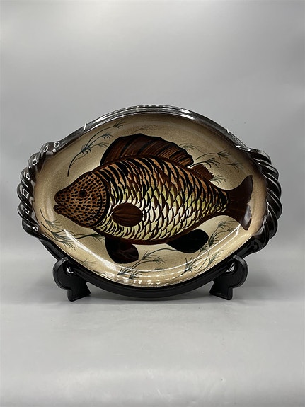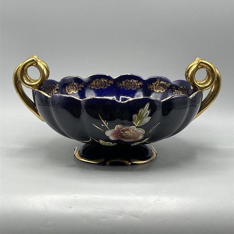 Kaksikahvainen keramiikkamaljakko, jossa on koristeellisia kultaisia yksityiskohtia, lintu ja kukka-aiheita. Valmistettu Kreikassa ja koristeltu 24 karaatin kullalla.