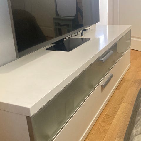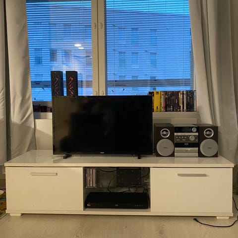 Myyntiin valkoinen hyvässä kunnossa oleva tv-taso.