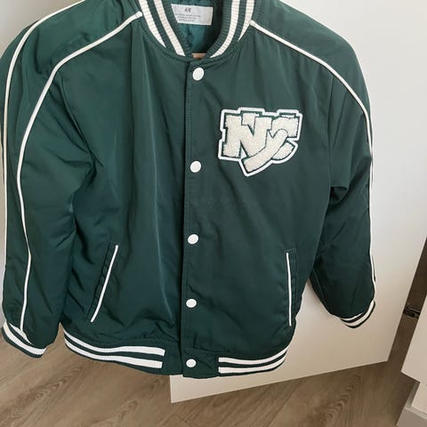 Zara lasten college-takki, unisex-malli, koko 152. Vihreä puuvillainen takki, jossa valkoiset hihat ja painonapit edessä. Edessä tekstit ja kuviointi rinnassa, resorit helmassa, hihansuissa ja kauluksessa. Sopii arkeen ja vapaa-aikaan kouluikäiselle lapselle.
