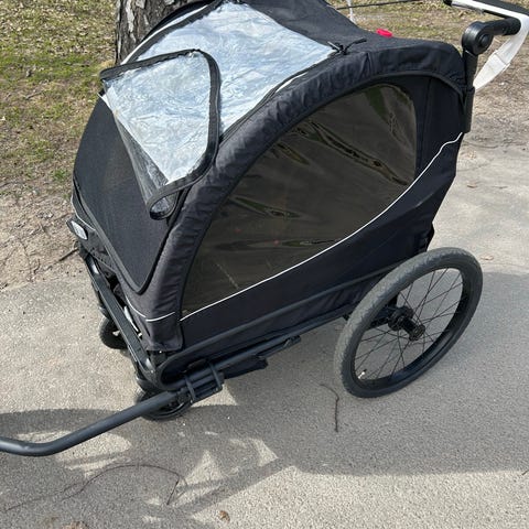 Hyväkuntoinen yhden istuttava pyöräkärry/juoksurattaat. Meillä käytetty juoksurattaina mutta mukana on myös vetovarsi polkupyörään kiinnittämistä varten.