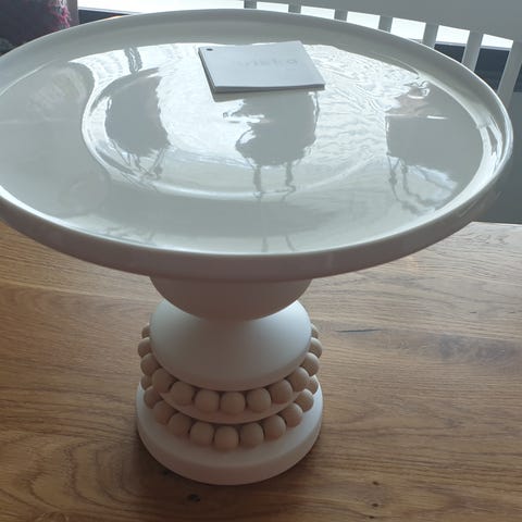 Uusi Aarikka Mamselli tarjoiluvati. Valkoinen, jalallinen tarjoiluvati, jossa koristeena vaaleat puuhelmet jalan ympärillä.