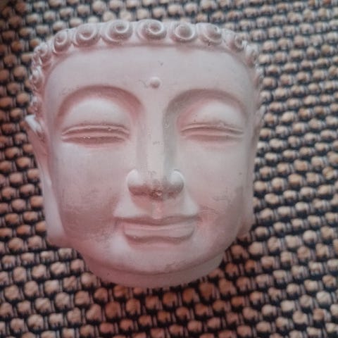 Buddha- pää koristefiguuri puutarhaan. Patsas esittää buddhalaista päätä ja on väriltään ruskeasävyinen, pinnassa on patinoitunutta ja eläväpintaista viimeistelyä. Sopii käytettäväksi sisustuselementtinä hyllyllä, tasolla tai lattialla. Materiaali vaikuttaa olevan kova ja painava, mahdollisesti kivi- tai keraaminen massa. Tarkat mitat ja materiaali eivät ole tiedossa.