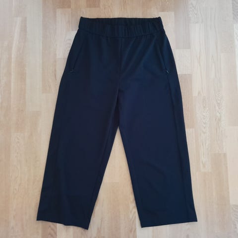Lindex Wide housut naisille. Koko 34. Väri musta. Materiaali polyesteri. Malli on leveä ja lahkeet kapenevat hieman (tapered leg). Housuissa on vyötärönauhassa haka-, nappi- ja vetoketjukiinnitys sekä takana taskut. Sopivat arki- ja toimistokäyttöön.