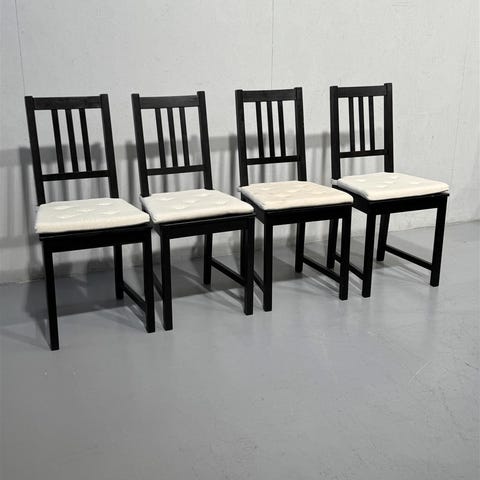 Ikea Stefan tuolit, joissa on mustaksi maalattu puurunko ja mukana vaaleat pehmusteet. Tuolit ovat valmistettu Kiinassa ja niissä on selkeä, yksinkertainen muotoilu. Kevytrakenteiset.
