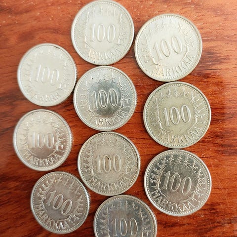10 kpl 200 mk hopeakolikoita "pillerirasiassa" eri vuosilta yht. Hintaan 80 e