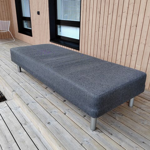 120cm leveä runkopatjasänky. Mukaan saa petauspatjan, mutta suojusta petarille ei ole.