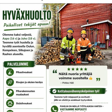 Kokenut paikallinen tiimi erilaisiin metsätöihin taimikoissa, harvennuksilla ja tontin ym. raivuissa ja pihatöissä.