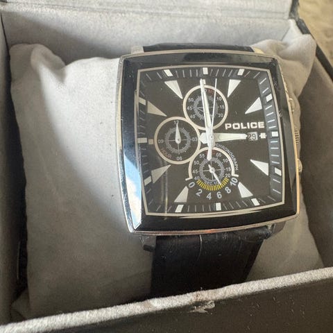 Police 10971J miesten rannekello. Kellossa on musta ranneke ja hopeansävyinen, kulmikas kellotaulu. Kellon hihna irronnut mutta tilalla on naru.