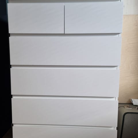 Myydään siistikuntoinen Ikean Malm lipasto. Väri valkoinen, neljä laatikkoa. Rakenteeltaan lipasto on moitteettomassa kunnossa, laatikot toimivat hyvin ja ovat myös sisäpinnoilta siistit. Joitain pieniä kolhuja, katsothan kuvat.