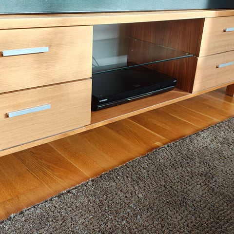 Tv-taso, jossa kaksi lasiovea ja metallivetimet. Materiaalina massiivipuu, koivuviilutettu . Sisällä on hyllytilaa laitteille ja säilytykselle. Soveltuu television ja viihdelaitteiden sijoittamiseen olohuoneeseen tai muuhun asuintilaan. Taso on tällä hetkellä Merimaskussa