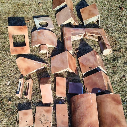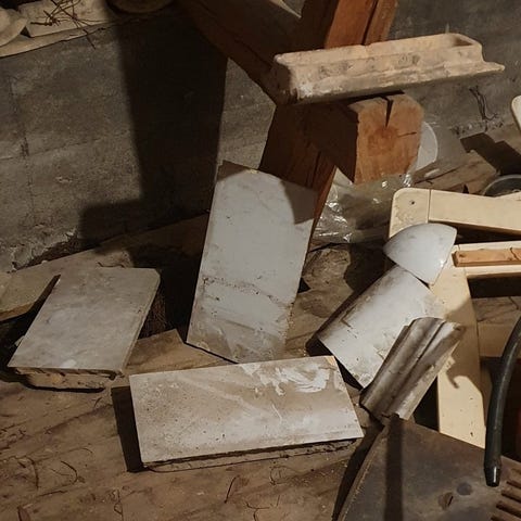 Kaakeleita puuttuu. Joitain vaurioita ja yksi kaakeli halki.