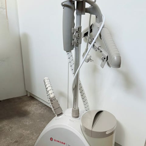 Singer vaatehöyrystin. Lattiatasoinen höyrystin, jossa on integroitu vaateripustin ja säädettävä teleskooppitanko. Laitteessa on irrotettava vesisäiliö, jonka tilavuus on merkitty asteikolla. Höyryletku ja höyrypää on tarkoitettu vaatteiden ja tekstiilien rypyttömään käsittelyyn pystyasennossa. Soveltuu esimerkiksi puseroiden, mekkojen, housujen ja muiden vaatteiden höyryttämiseen kotikäytössä. Ostettu uutena ja pari kertaa käytetty.