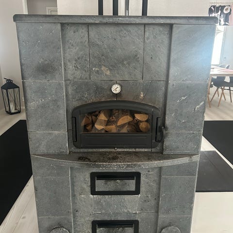 Purettavasta talosta Tulikivi TU30/5D varaava vuolukivitakka. Ostaja purkaa ja kuljettaa pois.