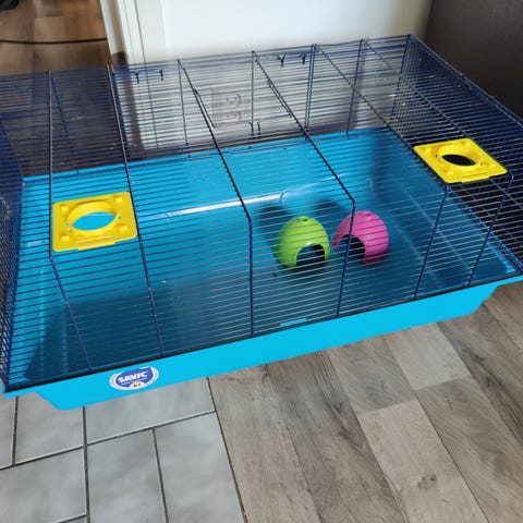 Hamsterin häkki tarvikkeineen. Mm juoksupyörä, kuljetushäkki jne. Toisen puolen kiinnitysklipsi puuttuu, mutta pysyy kyllä kiinni omalla painollakin. Jos ei uutta klipsiä meinaa ostaa niin varmaan ihan rautalanka/nippuside tms ajaa asian. Häkki on siis kirkasta muovia.