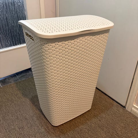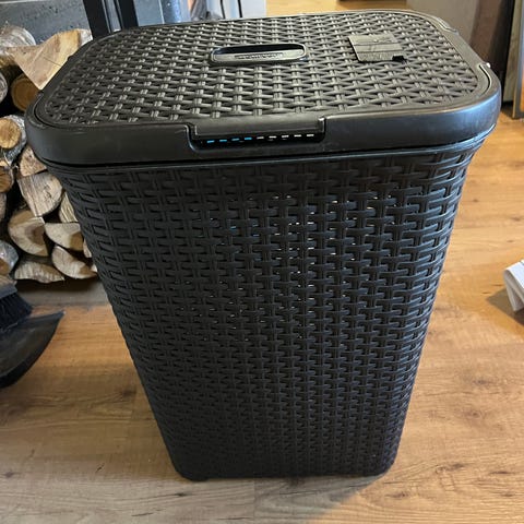 Muovinen pyykkikori, jossa on irrotettava tai avattava kansi. Väri harmaa. Ehjä ja siisti. Vain nouto