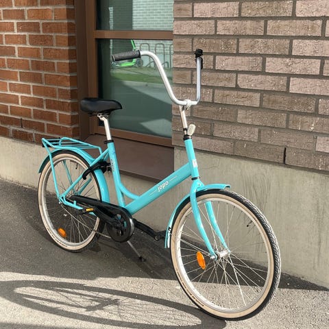 Pyörässä on matala runko helpottamaan kyytiin nousua, tavarateline takana sekä seisontatuki.