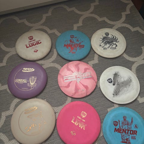 Erä frisbeegolf-kiekkoja useilta eri valmistajilta ja mallisarjoista. Kiekot ovat eri värejä ja tyyppejä, mukana todennäköisesti sekä draivereita, lähestymiskiekkoja että puttereita. Sopii frisbeegolf-harrastukseen esimerkiksi radalle tai harjoitteluun. Myydään yhdessä eränä kuvien mukaisesti.