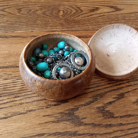 Sekalainen vintage korulajitelma naisten koruja. Laatikkossa erilaisia vintage koruja ja korunosia. Materiaalit vaihtelevat, mukana on muun muassa muovi- ja metallikoruja sekä helmi- ja helmimäisiä koruja. Värit ovat monivärisiä, esimerkiksi ruskean, vihreän, turkoosin ja kullan sävyjä. Sopii käytettäväksi sellaisenaan tai korujen ja askarteluprojektien materiaaleiksi.