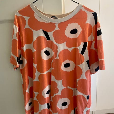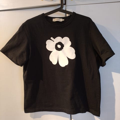 Marimekko T-paita harmaassa värissä, naisten koko M. Kuin uusi, kerran käytetty ja pesty. Printin kuuluu olla tuollainen hieman kulunut. Nouto onnistuu Tampereelta.