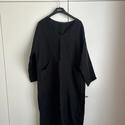 Musta kokovuorattu pellavamekko, vetoketju takana, taskut edessä. Merkki Nanso Luoto. Olka-Helma 100cm, kai-kai 48cm.Vähän käytetty ja hyvässä kunnossa.