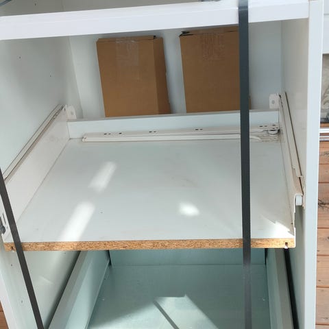 Brimnes vaatekaappi purettuna. Kaikki osat tallella. Kuvasta poiketen tässä ei ole alhaalla hylkykköä. Mukaan saa tankoon roikkumaan laitettavan kanagaslokerikon.