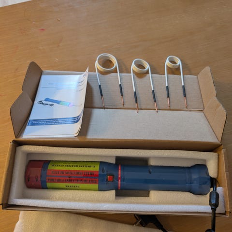 Kannettava induktiolämmitin, teho 1400 W. Laitteessa on verkkovirtajohto eurooppalaisella pistokkeella ja se toimii 220–240 V, 50/60 Hz jännitteellä. Mukana tulee erilaisia induktiokeloja ja tarvikkeita, jotka soveltuvat esimerkiksi pulttien ja muttereiden lämmittämiseen tai irrottamiseen metallirakenteista. Laitteessa on virtakytkin rungossa ja se on tarkoitettu sisäkäyttöön. Soveltuu metalliosien paikalliseen lämmitykseen korjaus- ja huoltotöissä.