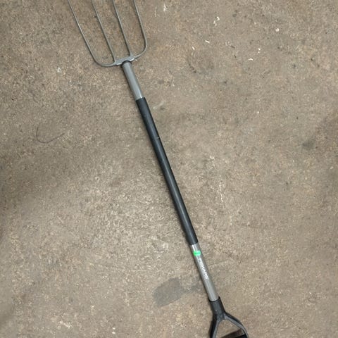 Metallinen talikko, jossa on harmaa varsi ja nelipiikkinen terä. Terät kaipaavat vähän suoristusta.