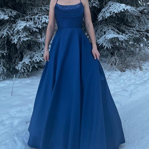 Kahdesti käytetty vanhojentanssimekko. Selässä nyöritys, eli kokoa voi hieman säätää. Mukana tulee pukupussi (+henkari). Vannehame +10€