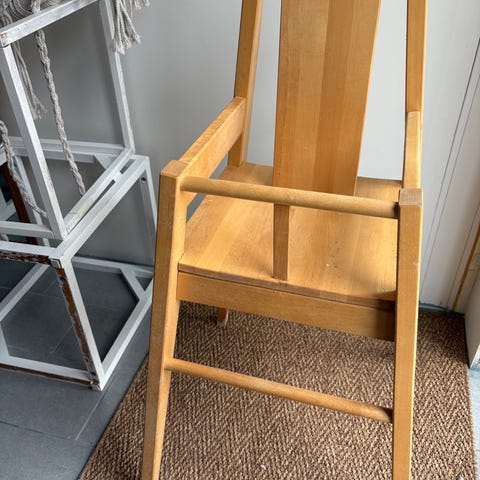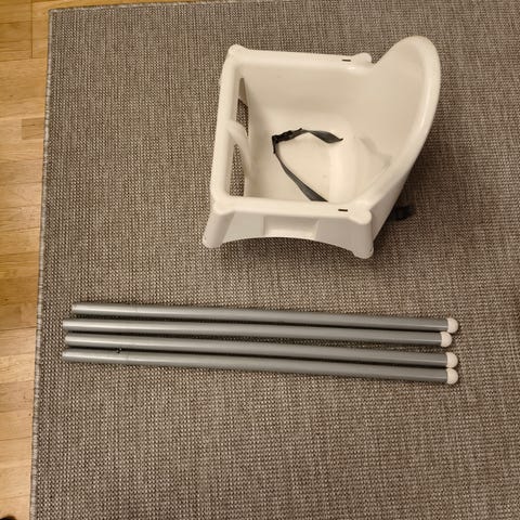 IKEA syöttötuoli, jossa valkoinen istuinosa ja irrotettava tarjotin sekä harmaat metallijalat. Tuolissa on pehmuste, joka lisää istuinmukavuutta. Soveltuu pienille lapsille ruokailuun ja leikkihetkiin pöydän ääressä. Helppo pitää puhtaana pyyhkimällä.