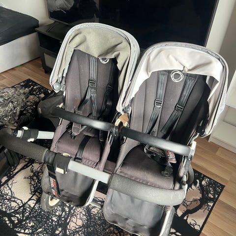 Kaksi istuinosaa, jotka on varustettu viisipistevaljailla. Vaaleanharmaat kuomut ja pehmusteet sekä musta runko. Mukana on irrotettava turvakaari, 1 erillinen lämpöpussi/jalkapeite sekä adapteri turvakaukalon (Maxi-Cosi, Nuna)kiinnitystä varten. Sekä 2 kappaletta Bugaboon sadesuojia.