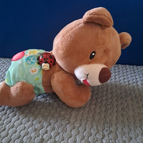 Konttaava ja laulava nalle. Nallessa on erilaisia toimintoja, kuten valot ja äänet, jotka kiinnittävät lapsen huomion ja edistävät vuorovaikutusta. Se opettaa myös perusvärejä ja -muotoja. Lelu sopii 6–36 kuukauden ikäisille lapsille. Erinomaisessa kunnossa.