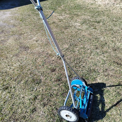 Myydään toimiva akkukäyttöinen ruohonleikkuri, terä teroitettu.