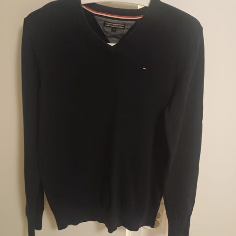 Myydään siisti musta Tommy Hilfiger neulepaita. Koko on 152 cm ja materiaali 42% viskoosin, 28% puuvillan, 26% polyamidin ja 4% kashmirin sekoite.