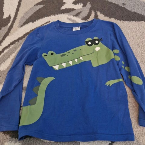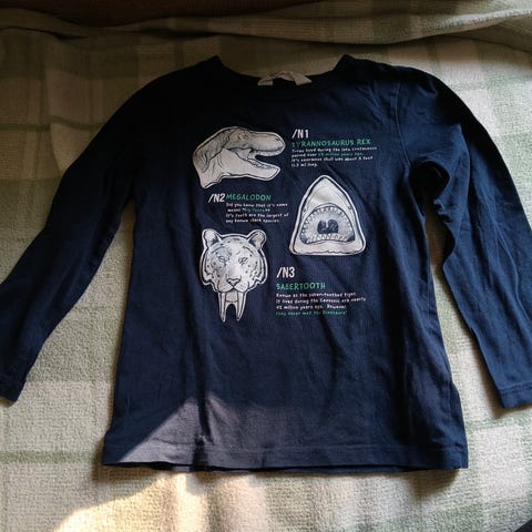Lasten pitkähihainen paita, jossa edessä dinosauruskuvio. Koko 116. Väriltään sininen. Materiaali vaikuttaa olevan ohutta trikoota, joka soveltuu arki- ja sisäkäyttöön. Paita on malliltaan suora ja siinä on pyöreä pääntie.