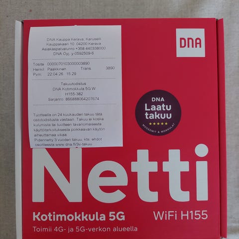 5G-mobiilireititin kotikäyttöön, väri valkoinen. Laitteessa on useita Ethernet-portteja kaapeliyhteyksiä varten sekä virtalähde mukana. Soveltuu langattoman ja langallisen internetyhteyden jakamiseen kotiympäristössä DNA:n mobiiliverkon kautta.