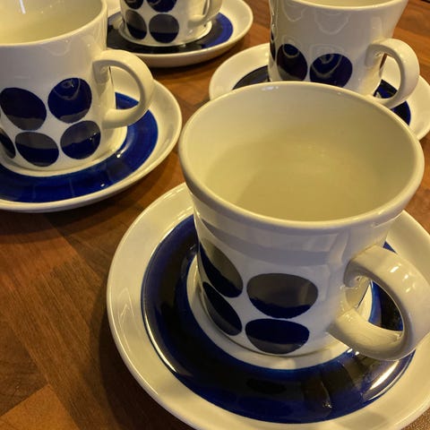 6kpl Arabian Faenza sinikukka mokkakuppeja tasseineen. Muuten ehjät ja siistikuntoiset mutta yhdessä tassissa pieni halkeama, myös pientä käytönjälkeä löytyy. Toridiili tai nouto Turusta.