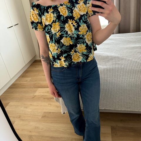 Gina Tricot t-paita naisille, koko S. Materiaali on pääosin polyesteriä, jossa on hieman elastaania joustavuuden lisäämiseksi. Paita on kirjavan kukkakuvioinen ja pohjaväri on tumma. Mallissa on lyhyet hihat ja V-pääntie.