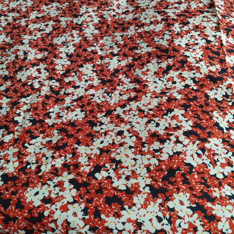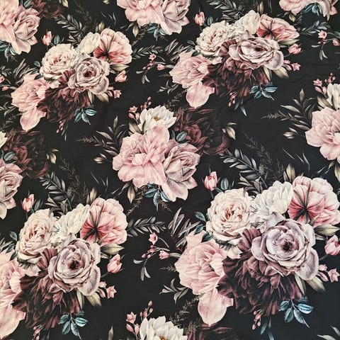Puuvillasatiini kukallinen kuvio mustalla pohjalla.