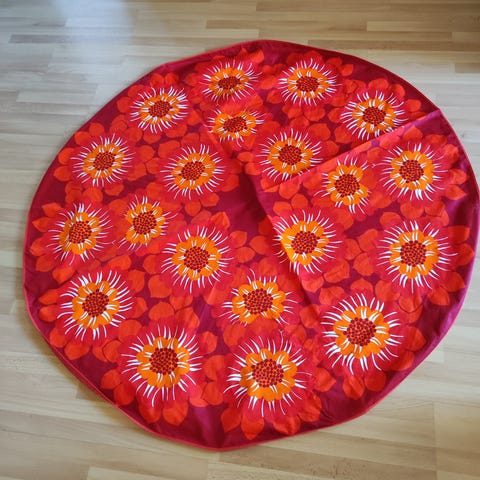 Myytävänä pyöreä, 60-luvun, retro pöytäliina, halkaisija 140 cm.
