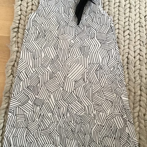 Papu mekko tytöille. Koko 134/140 cm (noin 9–10 v). Materiaalina puuvilla. Mekossa on pitkät hihat ja vinoon kulkeva raidallinen, musta-valkoiset raidat. Valkoinen ei enää niin kirkas. Sopii arkeen ja vapaa-aikaan käytettäväksi puuvillamekoksi.